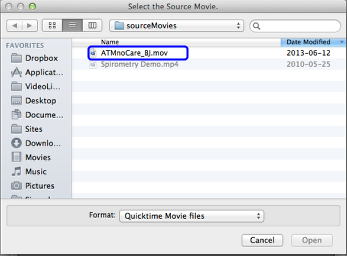 When opening a movie file in a file dialog by default the QuickTime Movie Files Format is enabled. Here you can see the movie 'ATMnoCare_BJ.mov' is enabled,